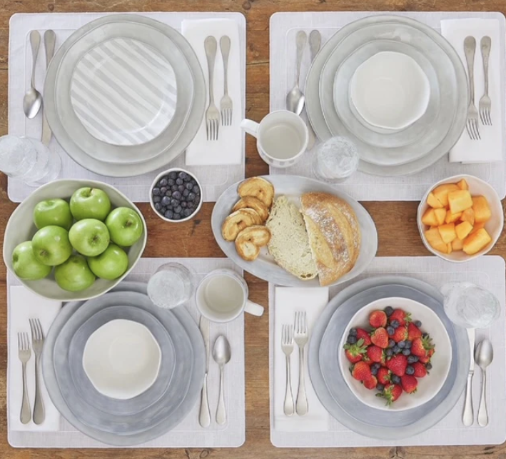 Azores, our new hand painted line, reminds us of the beautiful shimmering lagoons, and breathtaking waterfalls found on the magnificent Portugal islands of Azores. Artists carefully hand paint the borders of each plate using a matte glaze for Blue Lagoon and a beautiful light grey for Greige Shimmer. We have added coordinating striped salads and mugs to complete this beautiful line. Freezer, oven, microwave and dishwasher safe.