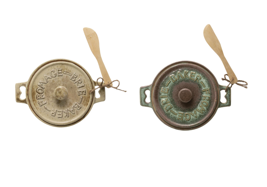 7" Round x 3-1/4"H Stoneware Brie Baker w/ Bamboo Spreader, Reactive Glaze, 2 Colors (Each One Will Vary)