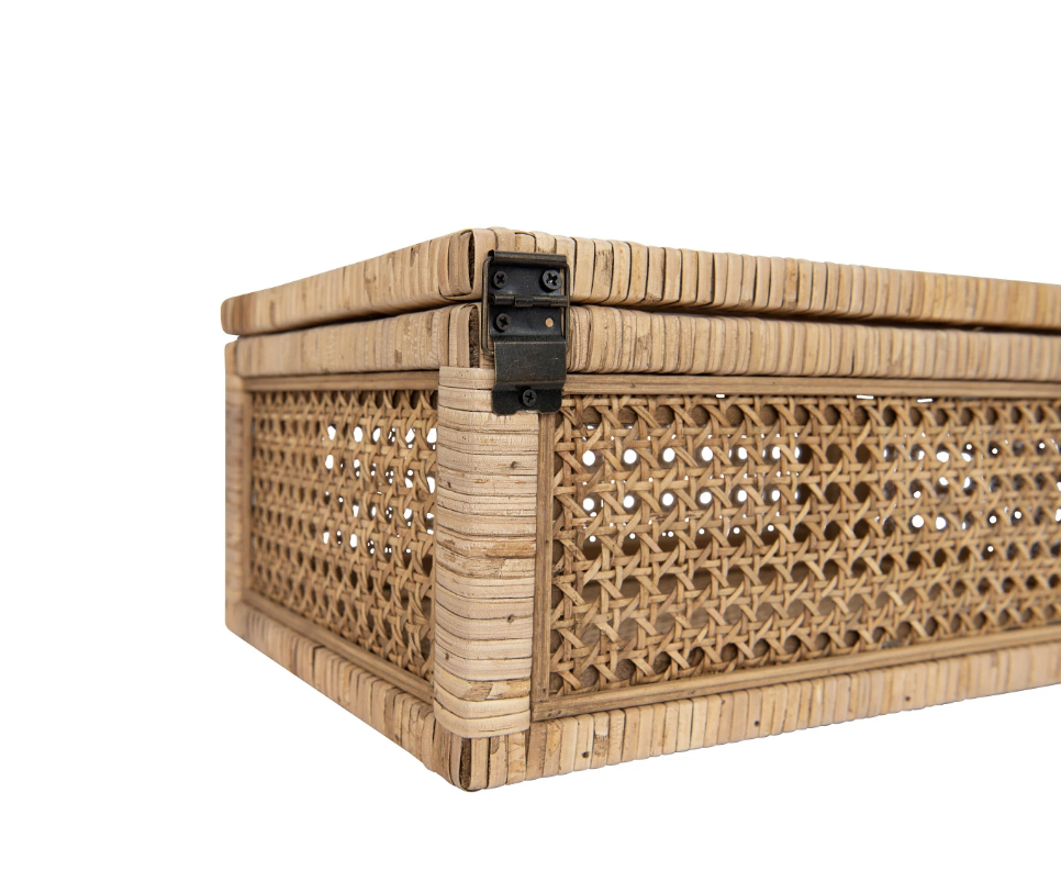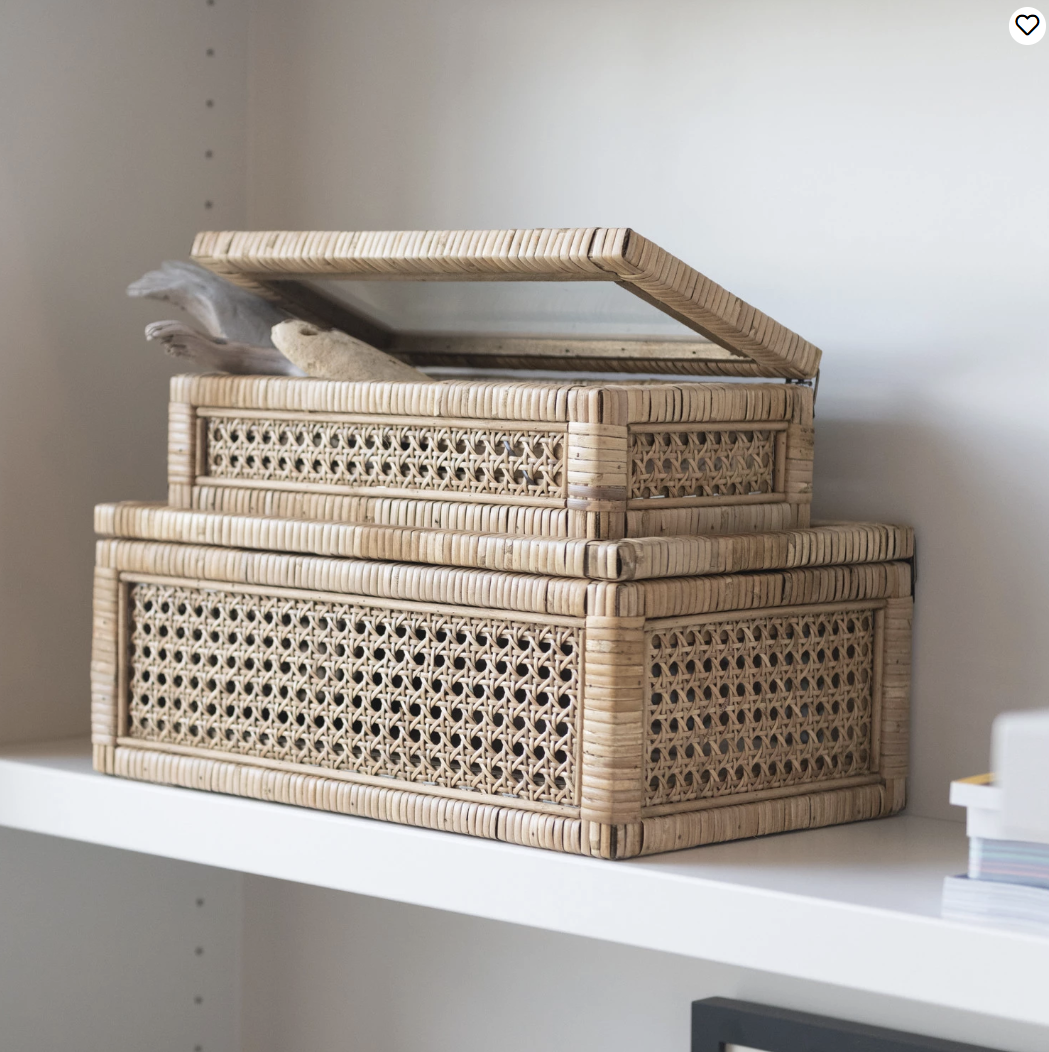 Clear glass on the lids allow the contents of each container to be seen without opening. These amazing rattan boxes are perfect for storing items on the dresser or any shelf. They can also be stood upright with something special displayed inside.