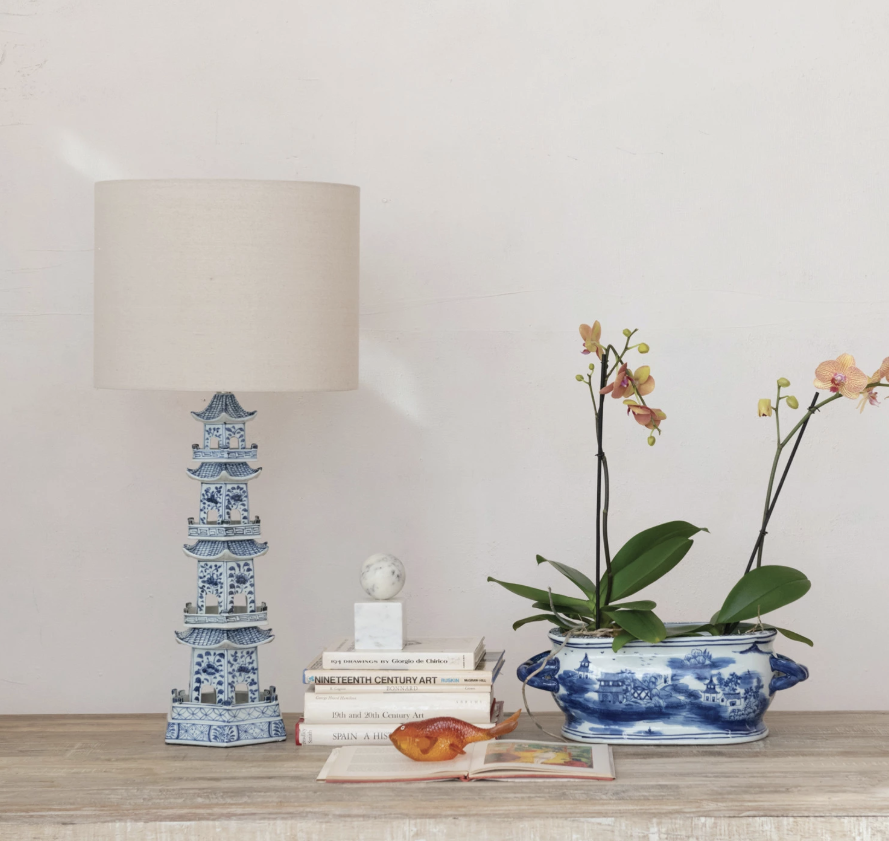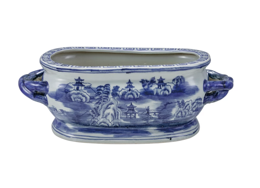 17-1/2"L x 9"W x 7"H Oval Hand-Painted Stoneware Vintage Reproduction Planter w/ Landscape & Handles, Blue & White