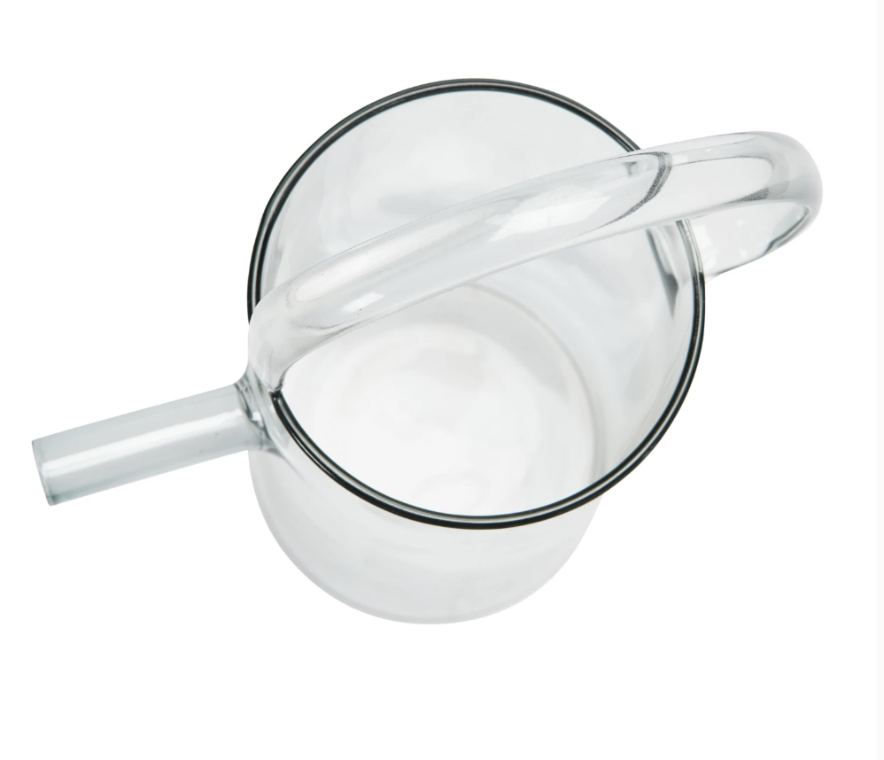 This mid-century modern pitcher showcases a stunningly sleek glass silhouette in a subtle transparent hue. Glass pitcher in blue. Add a hint of modern art to any living space or tablescape with this contemporary watering can. Made from 100% glass.
